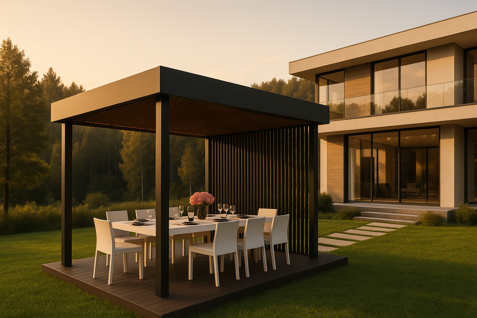 Carcasă metalică cu dimensiunile 4.0 × 3.0 m, cu acoperiș înclinat pentru drenaj eficient
